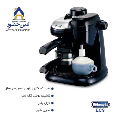 اسپرسوساز دلونگی مدل EC9 محصولی ساده، سبک، کاربردی و مخصوص مصارف خانگی است. همچنین توان مصرفیاش پایین بوده و از یک سینی چکهگیر هم برای نظافت و راحتی بیشتر کاربر بهره میبرد. از مشخصات این محصول میتوان به داشتن سیستم واریو برای انتخاب طعم دلخواه، از قهوهی ملایم تا قهوهی غلیظ اشاره کرد. این مدل از فناوری انحصاری دلونگی با نام IFD یا سیستم کفساز فوری (Instant Froth Dispenser) بهره میبرد که با استفاده از بخارآب، فشار هوا و شیر، کف یا شیر غلیظی که مناسب برای کاپوچینو است آماده میسازد. قابلیت تنظیم میزان بخار از دیگر قابلیتهای این دستگاه است.